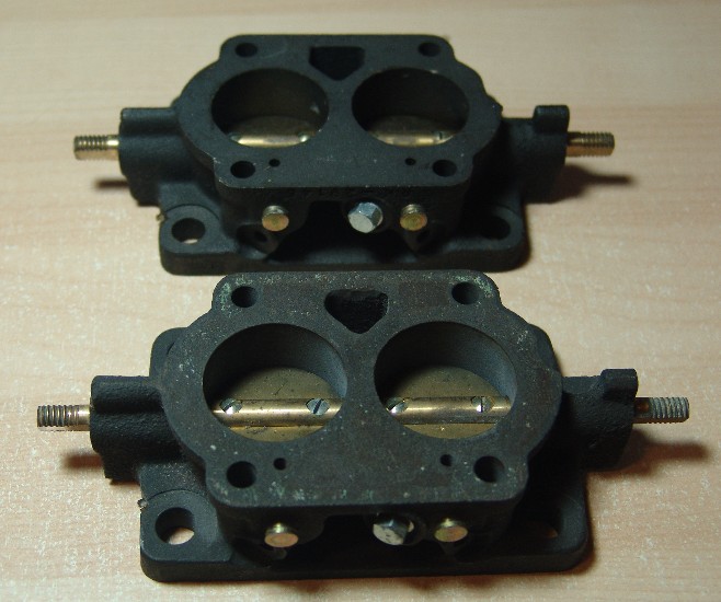 Zenith 32NDIX throttle plates. These are NOS (new old stock = never been used) for a Unimog, but can be used on a 356 by filling a space on the bottom with epoxy. They are otherwise interchangeable. One has some gasket residue, but it has never been used on a car. $250 for the pair, plus shipping.